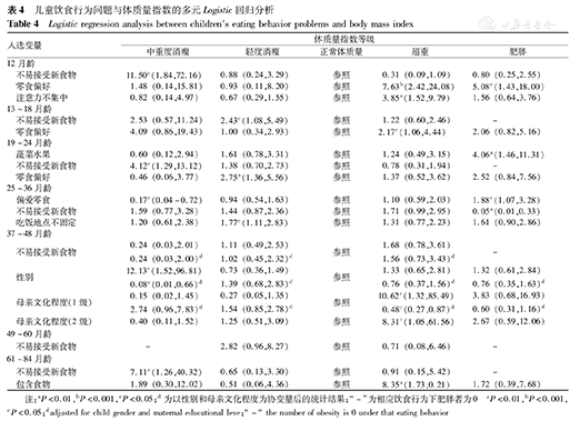 为分析儿童饮食行为对儿童体格发育的影响,本研究以BMI作为儿童体格发育的指标,以χ2检验分析儿童饮食行为和母亲喂养行为与BMI的相关性为基础(表3),采用多元Logistic分析儿童饮食行为与发生消瘦、超重及肥胖危险度的关联,结果发现,儿童饮食行为与儿童BMI存在较高的关联度,见表4。如在12月龄组,不易接受新食物的儿童更易发生中重度消瘦,存在零食偏好和吃饭时注意力不集中的儿童更易发生超重和肥胖。在13~18月龄组,不易接受新食物的儿童更易发生轻度消瘦,零食偏好更易导致儿童发生超重和肥胖。19~24月龄组,不易接受新和偏爱零食的儿童更易发生消瘦,很少吃蔬菜/水果的儿童更易发生肥胖,25~36月龄组,偏爱零食的儿童不易发生消瘦,更易发生肥胖,吃饭地点不固定的儿童更易发生消瘦,不易接受新食物的儿童不易发生肥胖。在37~48月龄组,儿童饮食行为与BMI的相关性存在性别和母亲文化程度的影响,统计学上未发现不易接受新食物与BMI存在关联。49~60月龄组统计学上也未发现不易接受新食物与BMI存在关联。61~84月龄组,不易接受新食物的儿童更易发生消瘦,常将食物含在嘴里的儿童更易发生超重。