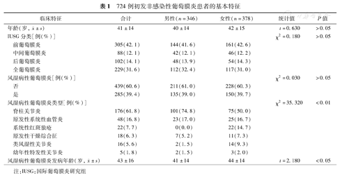 724例初发非感染性葡萄膜炎患者年龄4~79岁,平均年龄为41岁,基本特征见表1。依据风湿病诊断标准,约39.4%的初发非感染性葡萄膜炎患者被确诊风湿病性葡萄膜炎,其中男性患者占47%。风湿病性葡萄膜炎患者中,以脊柱关节炎(176例)和原发性系统性血管炎(48例)常见;48例原发性系统性血管炎病例中包括白塞病34例、结节性多动脉炎5例、显微镜下多血管炎4例、韦格纳肉芽肿3例和嗜酸细胞性肉芽肿性多血管炎2例。