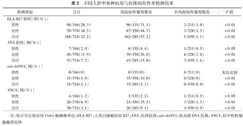 注:统计学比较采用Fisher精确概率法;HLA-B27:人类白细胞抗原B27;ANA:抗核抗体;anti-dsDNA:抗双链DNA抗体;ANCA:抗中性粒细胞胞质抗体