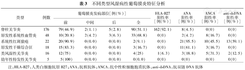 注:HLA-B27:人类白细胞抗原B27;ANA:抗核抗体;ANCA:抗中性粒细胞胞质抗体;anti-dsDNA:抗双链DNA抗体