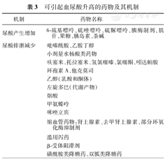 3.避免应用可升高血尿酸的药物,包括噻嗪类和袢利尿剂、某些抗结核药、小剂量水杨酸类药物、某些降糖药(磺酰胺类和双胍类降糖药)、含有乙醇的药物、左旋多巴、环孢素A、他克莫司等(表3)。