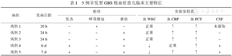 早发型GBS败血症5例中,3例在生后24 h内起病,1例系34+5周早产儿,因"呼吸窘迫"入院;2例因"皮肤黄染"入院,此3例患儿均无发热表现,入院时血WBC正常,但此3例患儿血CRP及PCT均明显增高,2例患儿行腰椎穿刺CSF检查无异常,1例家属拒绝检查。另2例早发型患儿分别于生后第6天和生后第7天入院,均有"高热"表现,入院时血WBC减低,PCT均显著升高,1例CRP亦同时增高。此2例均行腰椎穿刺CSF检查,确诊合并化脓性脑膜炎,见表1。