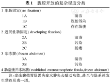 指剖腹手术后因皮肤和筋膜不能关闭而采取的临时性关腹。根据腹部的病理生理改变,腹腔开放的复杂程度分为四类,见表1。