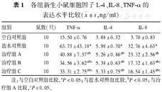 盐水对照组和治疗组A、B、C小鼠IL-4、IL-8、TNF-α表达均高于空白对照组(P均<0.05);治疗组A、B、C小鼠IL-4、IL-8、TNF-α表达均低于盐水对照组(P均<0.05);治疗组B、C小鼠TNF-α、IL-8表达均低于治疗组A(P均<0.05),IL-4水平在治疗组A、B、C间无明显差异(P>0.05)。