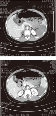 行保守治疗的18例Ⅲ级外伤性脾破裂患儿,1例中转开腹,17例保守治疗成功,均治愈出院,无死亡病例。住院时间为18~25 d,平均21 d。所有患儿于出院前均行超声和(或)增强CT复查,对17例患儿进行随访,外伤后1个月复查CT提示脾破裂创伤恢复良好,6个月后复查CT提示脾脏基本愈合。随访时间最短6个月,最长3年,均未发生并发症,CT检查显示肝脏形态结构基本正常。