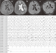 a.横断面T1WI,b.横断面T2WI,c.横断面FLAIR,d.冠状位FLAIR,e.长程脑电图;左侧大脑半球脑回变细,脑沟增多、加深,左侧脑室扩张,形态欠规则;异常脑电图,双侧半球不对称,左侧波幅高、放电多,左侧后头部或Rolandic区为主慢波夹杂多灶性尖波、(多)尖慢波接近持续发放。