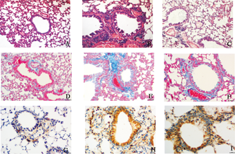 A-C:HE染色;D-F:Masson染色;G-I:FSP-1免疫组织化学染色;A,D,G:对照组;B,E,H:哮喘组;C,F,I:BUD治疗组。