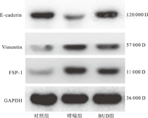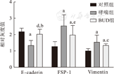 哮喘组与对照组相比,上皮细胞标志物E-caderin蛋白含量明显下降(P<0.01)。BUD组与哮喘组相比,蛋白表达量明显增高(P<0.01),与对照组相比,差异无统计学意义(P>0.05)(图2、图3);哮喘组与对照组相比,成纤维细胞表达标志物FSP-1蛋白含量明显升高(P<0.01);BUD组与哮喘组相比,蛋白表达量差异无统计学意义(P>0.05),与对照组相比,仍明显升高(P<0.01);哮喘组与对照组相比,间质细胞标志物Vimentin蛋白含量明显升高(P<0.01);BUD组与哮喘组相比,蛋白表达量略减少(P<0.05),与对照组相比,仍明显升高(P<0.01)。
