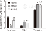 哮喘组与对照组相比,BALF中白细胞总数增加,嗜酸性粒细胞百分比明显增加,血浆OVA-sIgE明显升高,支气管壁增厚及胶原沉积面积增多(P<0.01),BUD组上述指标低于哮喘组(P<0.01);哮喘组BALF中TGF-β表达增多,在支气管上皮区域出现FSP-1的表达,实时定量PCR及蛋白质免疫印迹结果均显示,与对照组相比,哮喘组肺组织中E-Caderin表达减少,FSP-1及Vimentin表达增多。而BUD组与哮喘组相比,E-Caderin表达增多,TGF-β及Vimentin的表达略减少,而FSP-1表达量与哮喘组无差别。