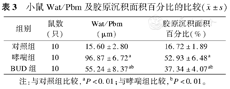 哮喘组与对照组相比,Wam/Pbm及胶原沉积面积百分比明显增加(P<0.01)。BUD组与哮喘组相比,Wam/Pbm及胶原沉积面积百分比略有减少,但与对照组相比仍明显增多(P<0.01)。见表3。