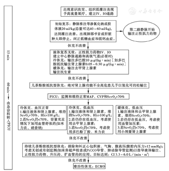 注:IV:静脉注射;IO:骨髓腔注射;PICU:儿科重症监护病房;MAP:平均动脉压;CVP:中心静脉压;ScvO2:中央静脉混合血氧饱和度;Hb:血红蛋白;PiCCO:脉波指示剂连续心排血量监测;CI:心脏指数;ECMO:体外膜肺氧合;1 mmHg=0.133 kPa