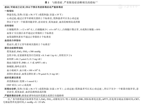 | 脓毒症诊断:发热(肛温>38.5 ℃)或低体温(肛温<35 ℃)、心动过速(低体温者可以无心动过速),伴以下至少一个脏器功能异常:意识改变、低氧血症、血清乳酸增高或洪脉 | |