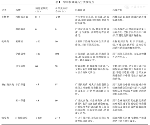 | 分类 | 药物 | 脑脊液浓度(%) | 血浆蛋白结合率(%) | 抗真菌谱 | 药效评价 |