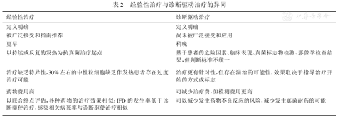 目前对IFD的诊断普遍采用分层诊断体系,即分为确诊、临床诊断和拟诊层。而在治疗策略上按照具有IFD高危因素的患者在治疗开始时的临床表现以及获得IFD诊断依据的种类及结果,可分为:抗真菌预防治疗、经验治疗、诊断驱动治疗和目标治疗[20,21]。