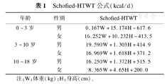 所有入选患儿自符合间接测热法纳入标准[3,4]的第1、4、7、10、14和21天时应用代谢车(The MedGrapics CCM/D System能量代谢测定系统)对受试者实施间接测热法,测得数据分别记为MREE1、MREE4、MREE7、MREE10、MREE14和MREE21,同时采用Schofied-HTWT公式[8](表1)推算PREE。