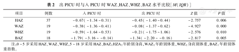 | 项目 | 例数 | 入PICU时 | 出PICU时 | Z值 | P值 |