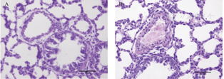 A.对照组14 d;B.模型组14 d,模型组与呼吸性细支气管伴行的肺小动脉管壁增厚,管腔变窄。