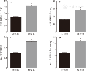 与对照组14 d比较,模型组14 d时,肺小动脉血管的中膜面积百分比、中膜厚度百分比明显增加(P<0.01),见图2A、图2B;RVHI明显升高(P<0.01),见图2C;右心室平均压力明显升高(P<0.01),见图2D。