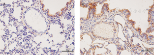 对照组14 d时,TRIP6主要表达于终末细支气管,而肺小动脉管壁中膜平滑肌无染色(图3A);模型组14 d时,TRIP6主要表达于肺小动脉平滑肌及外膜的细胞浆,同时支气管上皮及肺泡表达均阳性(图3B)。