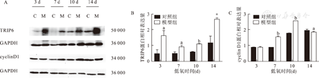 与对照组比较,模型组3 d、7 d、10 d、14 d时,TRIP6蛋白表达明显增高(P<0.05),见图4A、图4B及表1;cyclinD1蛋白3 d时两组比较差异无统计学意义(P>0.05),模型组7 d、10 d、14 d时,cyclinD1蛋白表达增高(P<0.05),见图4A、图4C及表1。