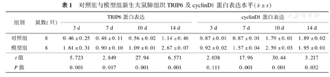 对照组与模型组新生大鼠肺组织TRIP6及cyclinD1蛋白表达水平(