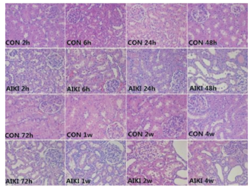 128只大鼠随机分为对照组(CON组)和模型组(AIKI组)。AIKI组64只,全部建立AIKI模型,并分别在手术后2 h、6 h、24 h、48 h、72 h、1周、2周、4周各处死8只,对照组64只,分别于上述各时间点处死8只。