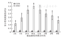 CON:对照组,AIKI:急性缺血缺氧再灌注肾损伤组;与对照组比较,aP<0.05,n=8。