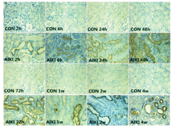 AIKI模型中大鼠肾组织KIM-1蛋白表达水平显著增加,其表达水平与肾小管间质损伤评分呈正相关,与Scr相比,KIM-1可能为更准确地反映肾损伤情况的指标。