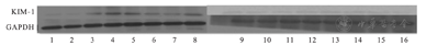 1、2、3、4、5、6、7、8分别代表缺血再灌注后2 h、6 h、24 h、48 h、72 h、1周、2周、4周;9、10、11、12、13、14、15、16、17、18分别代表对照组2 h、6 h、24 h、48 h、72 h、1周、2周、4周;KIM-1:肾损伤分子-1;GAPDH:3-磷酸甘油醛脱氢酶。