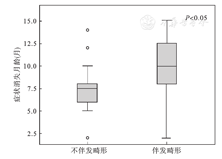 不伴发畸形组(n=18)呼吸症状消失月龄为(7.89±3.03)个月;伴发畸形组(n=31)呼吸症状消失月龄为(10.00±3.56)个月。两组间差异有统计学意义(t=2.11,P=0.04),伴发畸形组呼吸症状消失月龄大于不伴发畸形组,见图1。