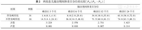 两组患儿确诊后3、6及12个月时的体重比较差异有统计意义(P<0.05),伴发畸形组患儿确诊后3、6及12个月时的体重百分位明显低于不伴发畸形组。而确诊后24个月两组患儿的体重百分位比较差异无统计学意义(P>0.05),见表2。
