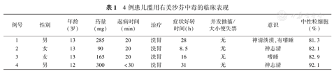 患儿滥用药物后约20 min产生症状,例1出现头晕、视物不清、恶心并呕吐3次,为非喷射状呕吐,呕吐后意识逐渐模糊,1 h后神情淡漠,反应迟钝。入院后患儿有嗜睡,于第2日午后起睡眠转正常。例2呕吐,共3次,呕吐物为胃内容物,无胆汁样物,无腹泻,自觉头晕、身体肿胀,问话可听懂,但不能辩认熟人,亦不能明确自身所处位置,约2 h后稍缓解,仍有头晕,可辨认周围人及位置。例3出现头晕、头痛、嗜睡、站立不稳等症状,不伴呼吸困难,无恶心、呕吐、腹痛,无语言障碍及手足抽搐等。例4神志清,出现头晕、讲话无力,并呕吐1次,呕吐物为胃内容物,呼吸平稳。4例患儿神经系统检查均无异常,无抽搐及深度昏迷。双侧瞳孔等大正圆,直径为3 mm,对光反射灵敏。心率及呼吸平稳,四肢肌力均正常。1例出现肠道功能紊乱,服药后未排大小便。具体临床表现见表1。