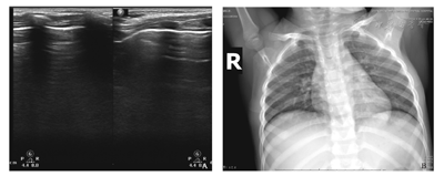 但是,CAP患儿并不均有肺实变,除了大叶性肺炎外,也可以是支气管肺炎和间质性肺炎,B-线的出现是肺间质综合征的特征性改变[13]。本研究结果显示,健康儿童肺组织一般可以见到3条以上A-线(图5),而所有CAP患儿病变区A-线均消失。然而其他肺疾病也可导致A-线消失,如肺间质性疾病、肺水肿时B-线出现时将消除A线[14,15],相反A线出现对气胸的诊断具有100%的灵敏性和60%的特异性。而对应于B-线和肺火箭征则完全不存在,这是A-线的严格特征。如伴随有肺滑动征消失情况,可以将气胸的诊断特异性提高到96%[15]。因此,在病理的条件下,A-线存在或消失仅提示肺脏病变,但并不是CAP的特异性改变。胸膜线异常在CAP时的发现率为98.3%,但其他疾病,如肺水肿、肺不张、肺出血、呼吸窘迫综合征等均可引起胸膜线异常[8,13,16],因此,胸膜线异常也不是CAP的特异性改变,这些都需结合超声的其他发现和患儿具体情况综合判断(图1, 图2, 图3, 图4)。在正常人只能看到极少量散在的B-线,但是当肺部疾病导致气体含量减少而炎性液体含量增加时,超声波在组织中多次反射,B-线就会出现;据文献报道约有28%的正常成人出现B-线[17]。本研究发现健康儿童中34.4%出现散在、孤立的B-线,比成年人出现的几率高,推测与小儿肺脏的病理生理特点有关;而CAP组中B-线出现为88.4%,且出现的数量和长度有变化,B-线的表现也有多样性。因此,出现B-线也不是CAP的特异性改变,需结合临床综合判断。本研究结果显示,尽管LUS检查无肺实变征象,但有A-线消失,同时伴有B-线及胸膜线异常3种征象时,其诊断CAP的敏感性和特异性为100%,准确率也为100%,表明这3种超声影像特征对儿童CAP可能有很高的诊断价值,提示可能为早期支气管肺炎或间质性肺炎的改变。