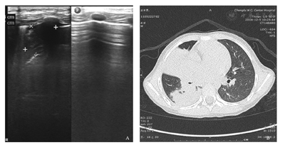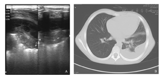 A.肺部超声可见胸膜线增厚、模糊,左肺内斑片状弱回声区,右前肺内肝样实变区,可见B-线,右侧胸腔少量积液;B.CT可见右肺广泛炎症,伴右肺门及纵隔淋巴结稍肿大,右侧少量胸腔积液。