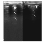 肺实变是CAP中重要的超声影像学特点,也是CAP诊断中容易识别的LUS征象,一旦发现有实变征象,再结合临床表现则具有确诊的意义。本研究中80例(46.2%)CAP患儿均见不同程度的肺实变;与之相伴的支气管征是在肺实变中常见到的一种超声图像特征,表现有支气管充气征、支气管充液征,在实时超声下可以见到支气管充气/充液征可以是动态的或是固态的,可以用以鉴别肺实变和合并肺不张[10]。肺不张的超声表现主要有病变区肺实变伴肺搏动、肺滑动征消失及平行排列的支气管充气征等[11,12],而动态空气支气管征的存在排除阻塞性肺不张[13]。LUS中发现大量胸腔积液的存在则提示压迫性肺不张[7];同时,利用积液的不同特点可以辅助判断其性质,如漏出液表现为无回声征象;渗出液可以是无回声,或低回声,或包含各种有回声的物质(浮游生物征),或有分隔[14](图4)。