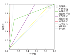 LUS各观察指标从ROC曲线图上显示A-线消失,B-线(甚至融合)、胸膜线异常相关性最强,支气管征次之,胸腔积液相关性最低(图6)。