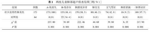 选取我院呼吸科经X线胸片确诊的CAP患儿173例(CAP组),另选同期门诊64例健康儿童行肺部超声检查作为对照组,比较两组声像图特征。