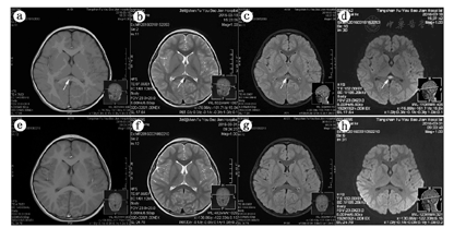 患儿,女,4岁,因发热2 d,阵发性不能视物1 d入院,a~d于起病后的第2天,MRI显示胼胝体压部椭圆形病灶;e~h为发病后10 d复查的MRI图像,胼胝体压部病灶完全消失;a、e为T1像,b、f为T2像,c、g为FLAIR像,d、h为DWI像。