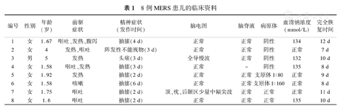 2016年1月至6月在唐山市妇幼保健院住院期间确诊为儿童MERS的患儿8例。其中男1例,女7例;年龄1.58~5岁,中位年龄1.75岁。8例患儿中,7例以急性感染症状起病,症状包括呕吐、腹泻、发热、咳嗽等。神经系统症状发生于起病后的2~5 d,其中6例表现为抽搐,1例头痛,1例表现为阵发性不能视物。其中1例女孩,2个月后再发1次。