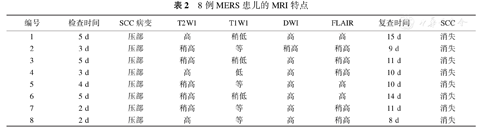 MERS是由Tada等[3]于2004年首次提出的一种临床-影像综合征。在此基础上,2006年Takanashi等[4]提出了MERS谱系的概念,将其分为两型,即MERSⅠ型(病变仅累及胼胝体压部)及MERSⅡ型[延伸到白质和(或)整个胼胝体受累]。本研究报道的8例患儿均为MERSⅠ型患儿,病变仅在胼胝体压部。
