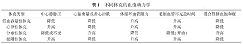 心脏原因引起的心输出量下降导致的休克为心源性休克,儿童多数是心肌收缩能力下降或者严重的心律失常导致的心输出量(cardiac output,CO)下降;血管收缩能力紊乱,致使血管扩张,系统血管阻力(systematic vascular resistance,SVR)下降,为分布性休克主要特点,可见于脓毒性休克早期,过敏性、神经源性休克等;低血容量性休克是儿童最重要的休克类型,多见于腹泻、外伤出血等;各种原因导致血液回流受阻称为梗阻性休克。不同休克类型血流动力学不同。根据血流动力学变化为基础的治疗,是理解并活用休克治疗原则的基础(表1)。