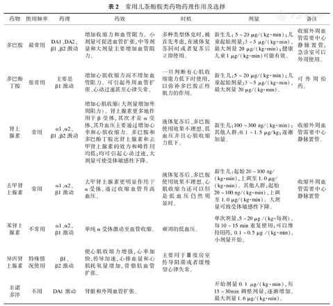 | 肾上腺素 | 常用 | α1、α2、β1、β2激动 | 增加心肌收缩(大剂量增加外周阻力)。肾上腺素更多地作用于β受体,其次才是α受体,其升血压主要通过增加心率和心肌收缩力。多巴胺和多巴酚丁胺比肾上腺素和去甲肾上腺素的效力和峰作用均低;均可引起心动过速,大剂量可使受体敏感性下降。 | 液体复苏后、多巴胺使用效果不理想、低血压并且心肌收缩力低下。 | 新生儿:100~300 ng/(kg·min);其他人群:0.1~1.5 μg/kg;逐渐加量。 | 收缩外周血管需要中心静脉置管。 |