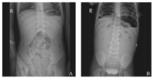 我院胃肠外科自2016年9月14日至2017年6月20日共收治3例口服布洛芬致十二指肠穿孔病例,其中女1例、男2例,年龄分别为2岁9个月、3岁、5岁,起病前均有上呼吸道感染高热超过39 ℃,为退热皆于起病前24~48 h内反复口服布洛芬5~8次,且均有2次服药间隔<4 h情况,其中2例更是有发热即口服,反复一夜4~5次,而说明书指示需间隔4~6 h方可再次服用,24 h服药次数不超过4次。而后才出现腹痛,即先发热后腹痛。3例患儿既往均无反复腹痛、反酸、呃逆、食欲欠佳病史,无消化性溃疡家族史。临床表现以腹痛、呕吐为主,其中1例患儿腹胀明显,均有腹膜刺激征,腹平片其中2例少量气腹,另1例大量液气腹,见图1。术前B超均无阳性提示。2例少量气腹患儿生命体征平稳,无休克表现,另1例大量液气腹患儿术前于急诊科即有休克,需抢救气管插管维持。