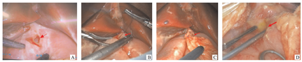 A.3D腹腔镜见十二指肠球部前壁穿孔(病例1);B.3D腹腔镜下缝合修补穿孔(病例1);C.3D腹腔镜下修补后网膜覆盖(病例1);D.剖腹探查见十二指肠球部前壁上方穿孔(病例3)