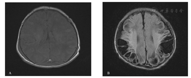 所有入组者住院期间均接受头颅B超或头颅MRI检查。对照组78例患儿中异常8例,异常率为10.26%,窒息组51例,异常27例,异常率为52.94%。轻度窒息患儿头颅影像学检查6例为阳性,重度窒息患儿21例均为阳性。其中:(1)脑组织水肿11例;(2)基底节-丘脑损伤(轻、中、重度)3例;(3)白质损伤(局灶型、广泛型、弥漫型)16例;(4)颅内出血(脑室管区-脑室内出血、脑实质出血、蛛网膜下腔出血)13例。1例重度缺血缺氧脑病患儿的头颅MRI检查结果见图2。