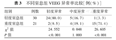 | 组别 | 例数 | 轻度异常 | 中度异常 | 重度异常 |
