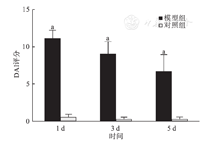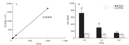 用PicoGreen®测定标准品和血浆中游离DNA含量,绘制标准曲线。标准曲线呈良好的直线关系,R2值为0.999 9。血浆中游离DNA含量:模型1 d组(716.83±134.29)明显高于其对照组(116.83±9.42)(P<0.05),3 d组(298.65±100.87)明显高于其对照组(94.36±23.88)(P<0.05),5 d组(148.14±15.16)明显高于其对照组(97.56±20.11)(P<0.05),见图3。