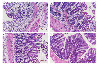 石蜡切片常规脱蜡,采用HE染色法,高倍光学显微镜下观察结肠远端黏膜损伤情况。