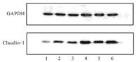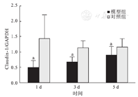 Western blot检测Claudin-1的表达结果显示,Claudin-1的表达量:1 d组(0.48±0.24)明显低于其对照组(1.42±0.79)(P<0.05);3 d组(0.67±0.18)明显低于其对照组(1.13±0.24)(P<0.05);5 d组(0.89±0.29)明显低于其对照组(1.15±0.29)(P<0.05)。对照组、模型组Claudin-1的Western blot检测结果及其与GAPDH的积分灰度值比值见图6、图7。