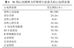 96例EFE患儿的心电图均不正常,包括:(1)窦性心动过速96例次(100%);(2)异位节律23例次(24%),其中室性心律失常8例次(8%),包括室性期前收缩5例次(5%),短阵室性心动过速3例次(3%);房性心律失常15例次(16%),包括室上性期前收缩9例次(9%),室上性心动过速6例次(6%);(3)Ⅰ°房室传导阻滞10例次(10%);(4)ST-T波改变75例次(78%),ST段多呈水平或斜行下降;T波改变表现为倒置、平坦或双向,多出现在左心前导联;(5)B型预激综合征9例次(9%);(6)左室肥厚72例次(75%),左室高电压25例次(26%),右室肥厚8例次(8%),具体见表1。